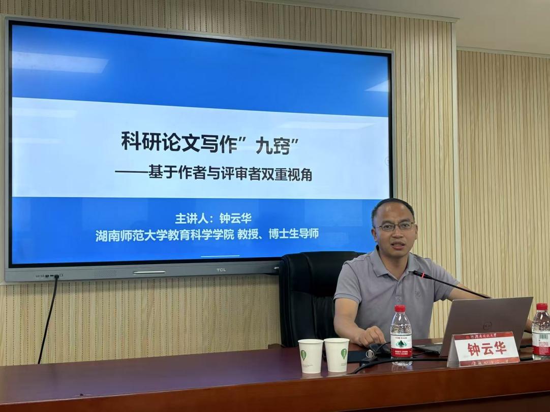 為了幫助學(xué)校科研人員提升論文寫(xiě)作水平,近日,湖南開(kāi)放大學(xué)講壇邀請(qǐng)湖南師范大學(xué)教育科學(xué)學(xué)院教授鐘云華來(lái)校作題為“科研論文寫(xiě)作‘九竅’”的學(xué)術(shù)報(bào)告,詳細(xì)介紹高質(zhì)量科研論文的寫(xiě)作規(guī)律。本次活動(dòng)由科研管理處組織,全校近40位老師參加。